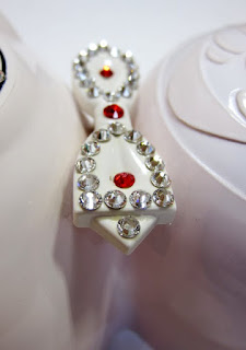 製造元であるカリフォルニアクロックカンパニーからシッポと目用のクリスタル到着。ボディカラーはピンクだが退色している為、新品のピンクのシッポはマッチしない。そこで発想を変え、ボウタイと目玉に合わせてホワイトをオーダー。ピンセットでは作業がしづらいので、デコ電/ネイルアート(!!)用のマジカルピックとか言う吸着式のツールを買ってみた。これは捗る!せっかちな私にはぴったり。シッポのクリスタルは古いジュエルドキットキャットの写真を何枚も見て検証してテンプレートを作り、その後は当時の職人(?)になったつもりでさくさくと、接着剤のはみ出しも気にせず割と雑に(笑)貼っていく。目は球面の為貼ったそばから流れてしまうのでテープで固定。